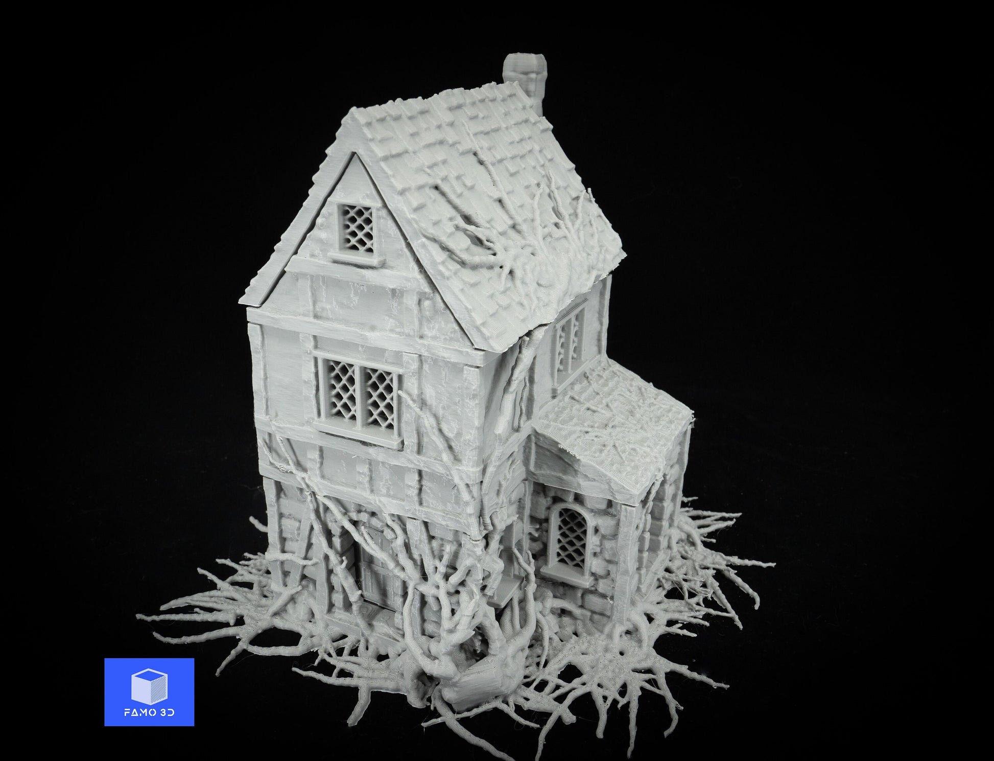 This 3-story, overgrown farmhouse is a great addition to any game. Each layer sits in place using small recesses. Doors can be made functional using a small piece of wire or with a peg.