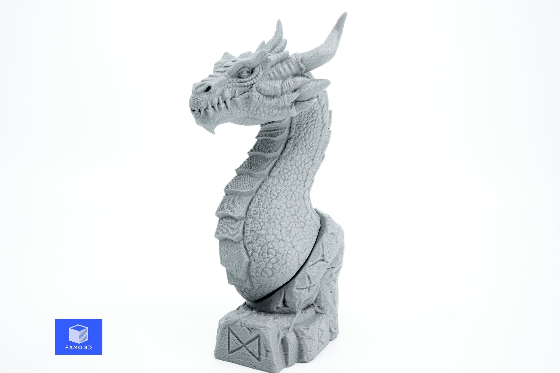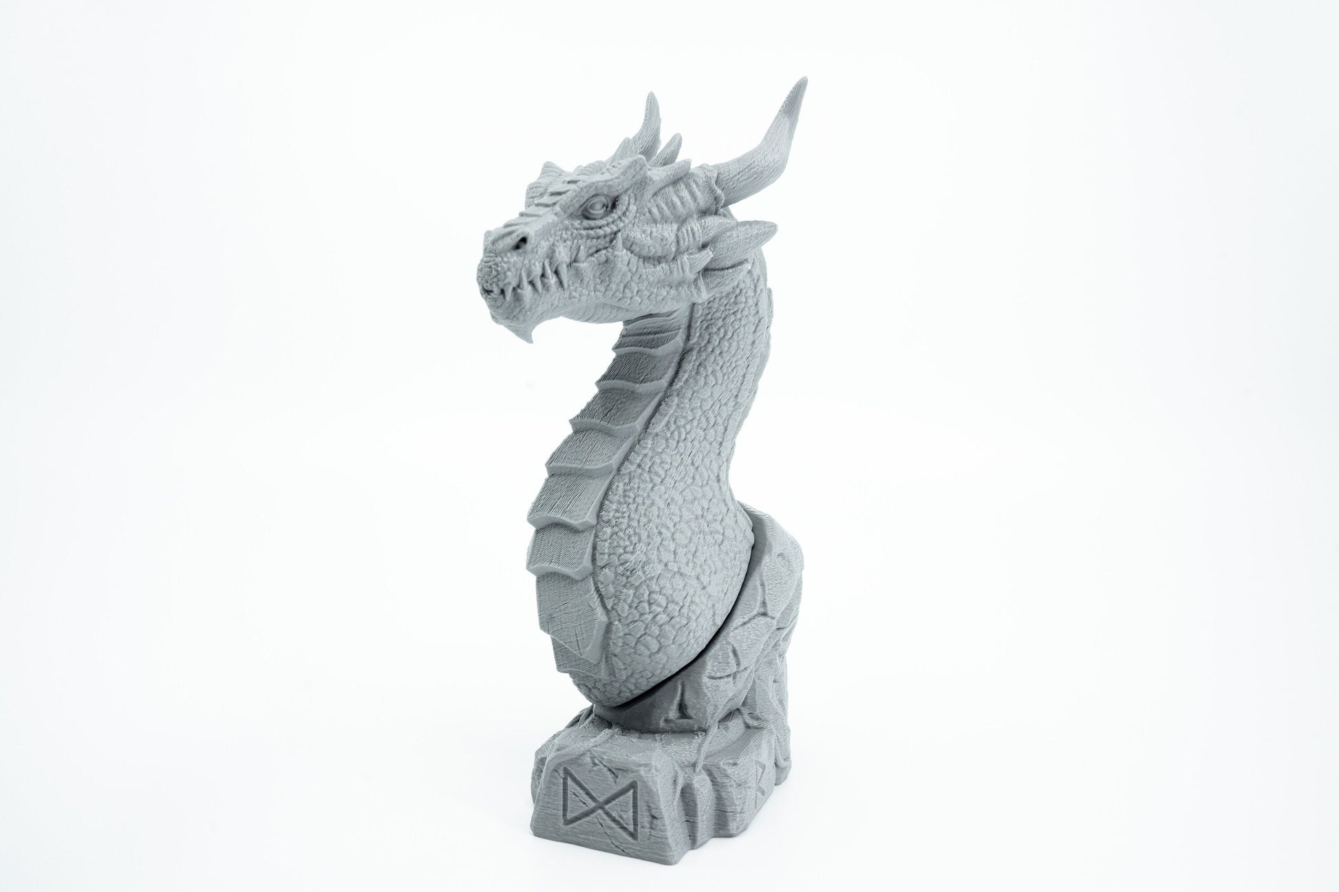 "Drafnir" by Drafnir Studios. This detailed dragon bust includes runes inscribed on the base. The item can be shipped in three pieces, or can be pre-assembled and glued at no extra cost.