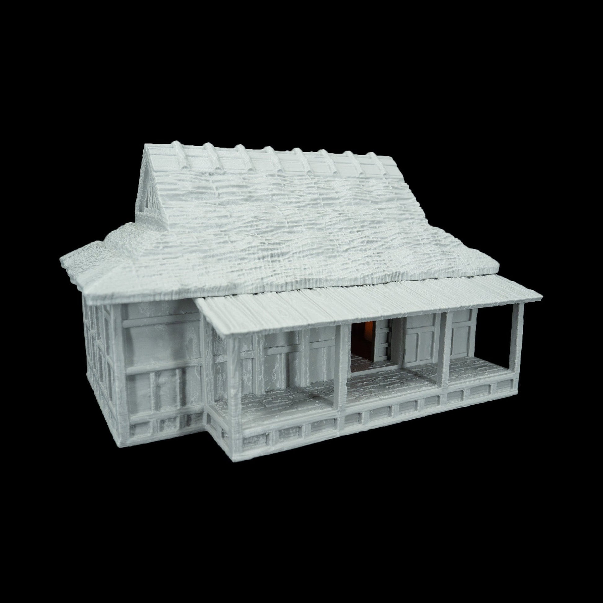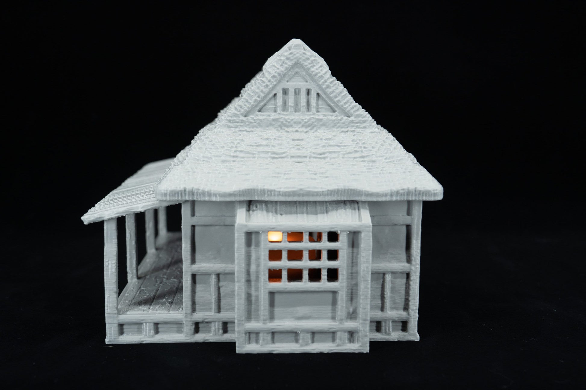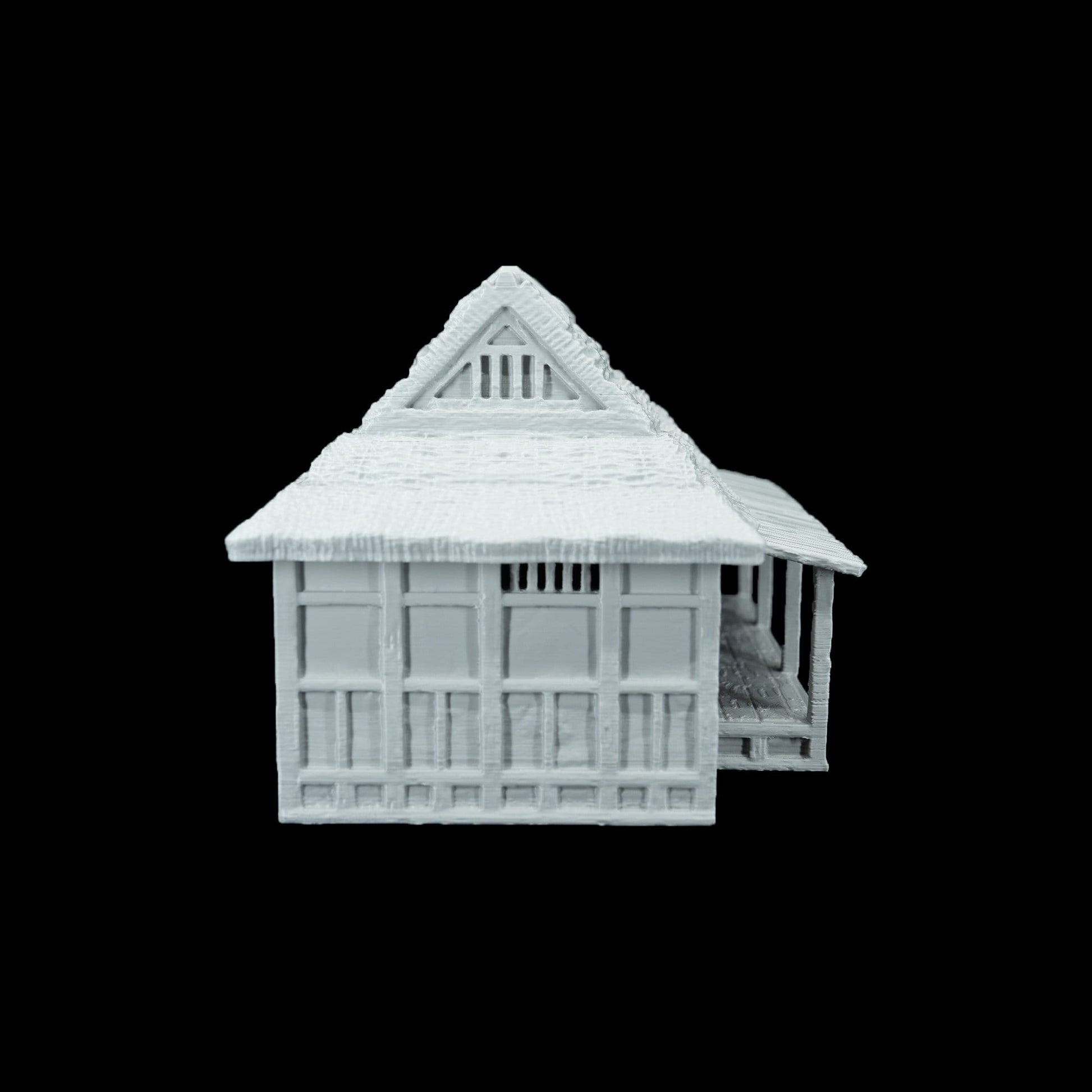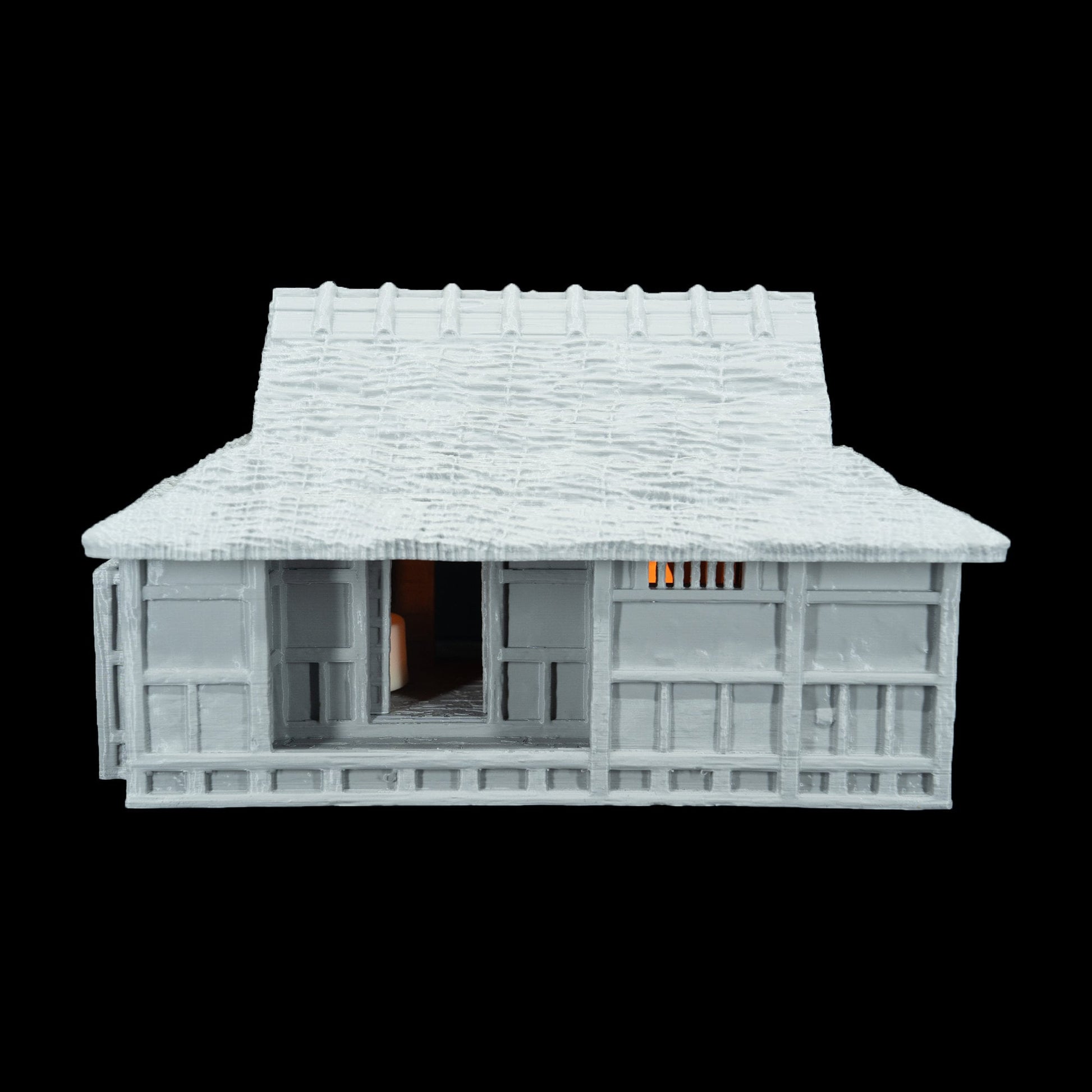 A detailed Samurai Cottage, made for use with 28mm miniatures. 3D printed in light gray PLA plastic.