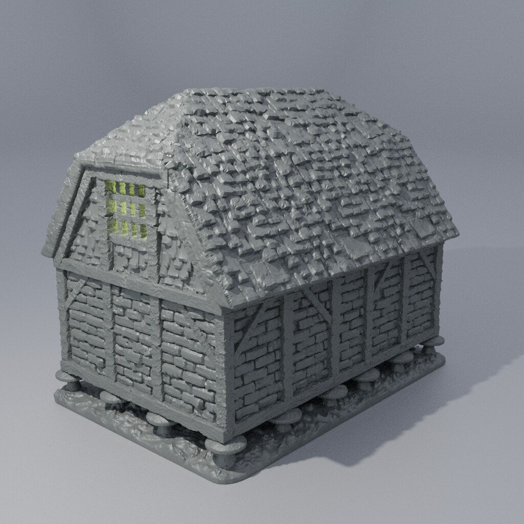 A detailed medieval granary for use in tabletop games. This item is designed to be used with 28mm miniatures. Printed in light gray PLA plastic.